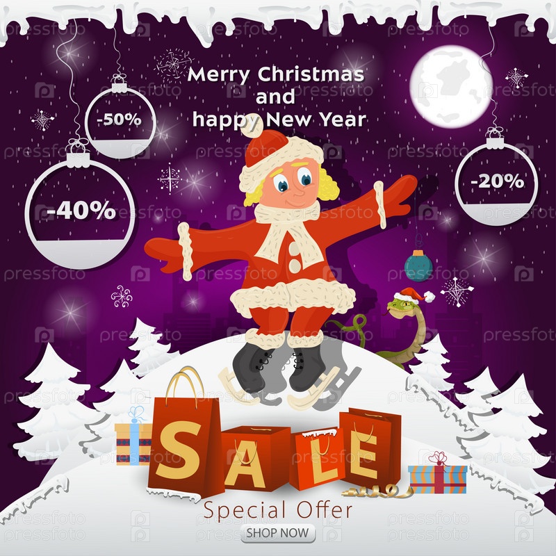 Баннер Рождественская распродажа надпись в виде пакетов на заснеженной поляне Девочка в костюме Санта-Клауса на коньках