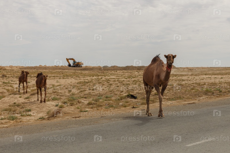 Верблюды на дороге в степи Узбекистана