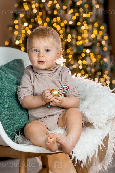 Семья. Красивый маленький белокурый мальчик 1 года сидит на фоне рождественской елки. Концепция празднования Рождества и Нового года