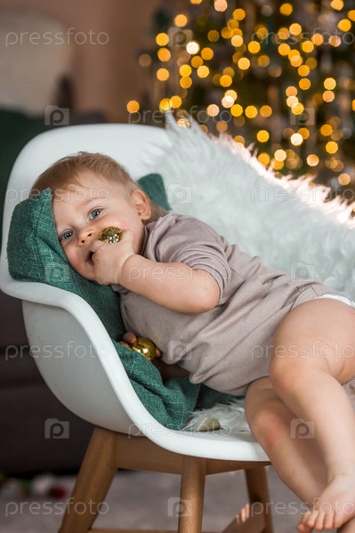 Семья. Красивый маленький белокурый мальчик 1 года сидит на фоне рождественской елки. Концепция празднования Рождества и Нового года