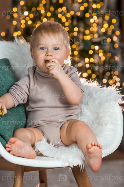 Семья. Красивый маленький белокурый мальчик 1 года сидит на фоне рождественской елки. Концепция празднования Рождества и Нового года