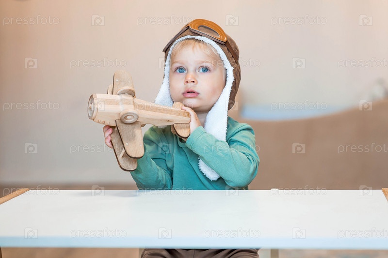 Симпатичный мальчик 2 лет в пилотской шапке играет с деревянным самолетом и конструктором логистики. Детские деревянные игрушки для развития ребенка