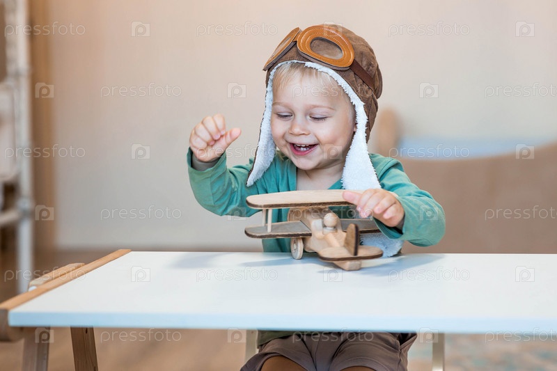 Симпатичный мальчик 2 лет в пилотской шапке играет с деревянным самолетом и конструктором логистики. Детские деревянные игрушки для развития ребенка