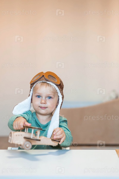 Симпатичный мальчик 2 лет в пилотской шапке играет с деревянным самолетом и конструктором логистики. Детские деревянные игрушки для развития ребенка