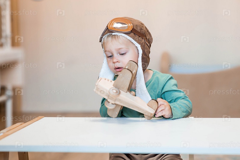 Симпатичный мальчик 2 лет в пилотской шапке играет с деревянным самолетом и конструктором логистики. Детские деревянные игрушки для развития ребенка