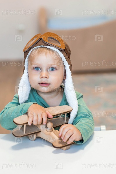 Симпатичный мальчик 2 лет в пилотской шапке играет с деревянным самолетом и конструктором логистики. Детские деревянные игрушки для развития ребенка