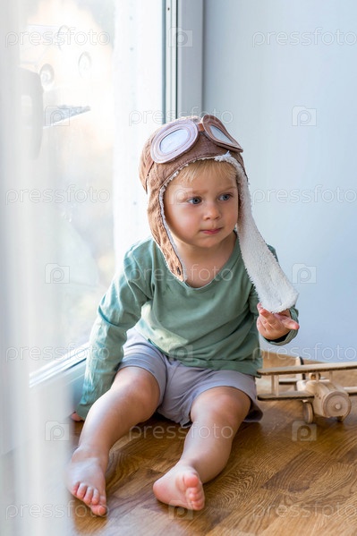 Милый 2-летний мальчик в кепке играет на подоконнике с деревянным самолетиком. Детские деревянные игрушки для развития ребенка