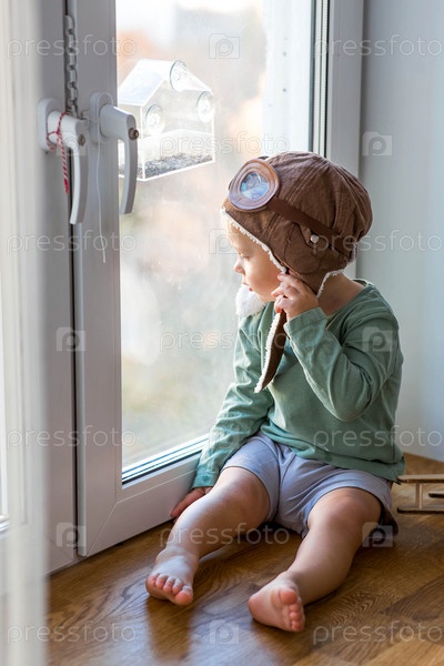 Милый 2-летний мальчик в кепке играет на подоконнике с деревянным самолетиком. Детские деревянные игрушки для развития ребенка