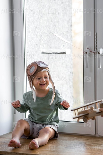 Милый 2-летний мальчик в кепке играет на подоконнике с деревянным самолетиком. Детские деревянные игрушки для развития ребенка