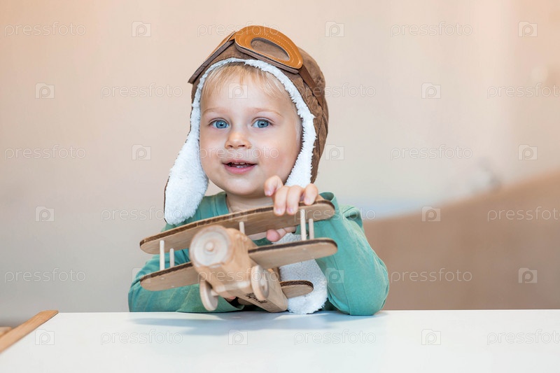 Симпатичный мальчик 2 лет в пилотской шапке играет с деревянным самолетом и конструктором логистики. Детские деревянные игрушки для развития ребенка