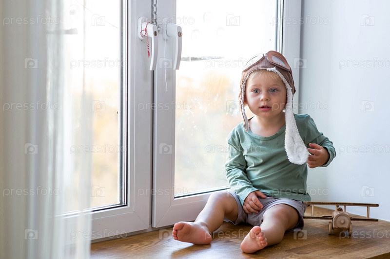 Милый 2-летний мальчик в кепке играет на подоконнике с деревянным самолетиком. Детские деревянные игрушки для развития ребенка