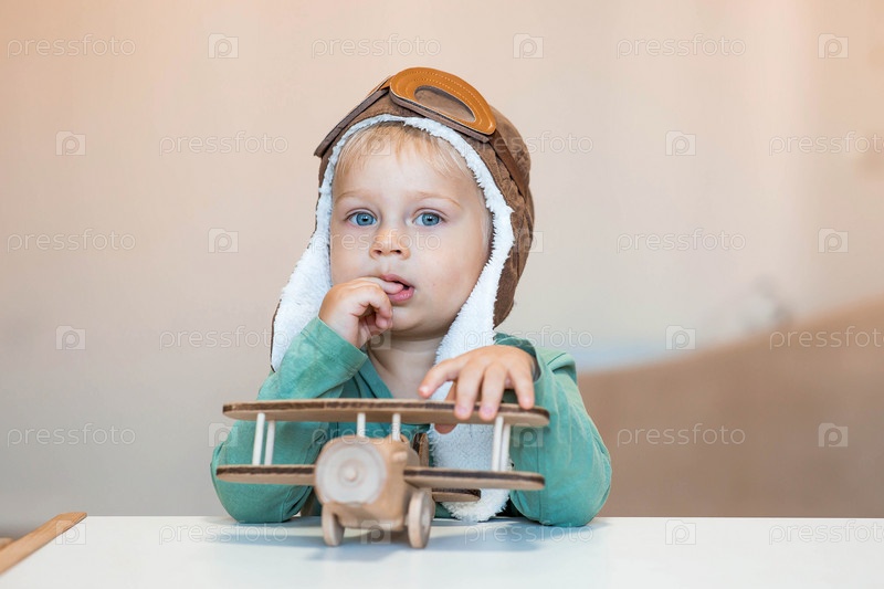 Симпатичный мальчик 2 лет в пилотской шапке играет с деревянным самолетом и конструктором логистики. Детские деревянные игрушки для развития ребенка