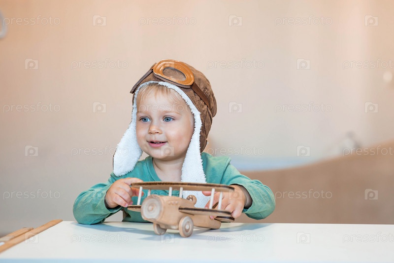 Симпатичный мальчик 2 лет в пилотской шапке играет с деревянным самолетом и конструктором логистики. Детские деревянные игрушки для развития ребенка