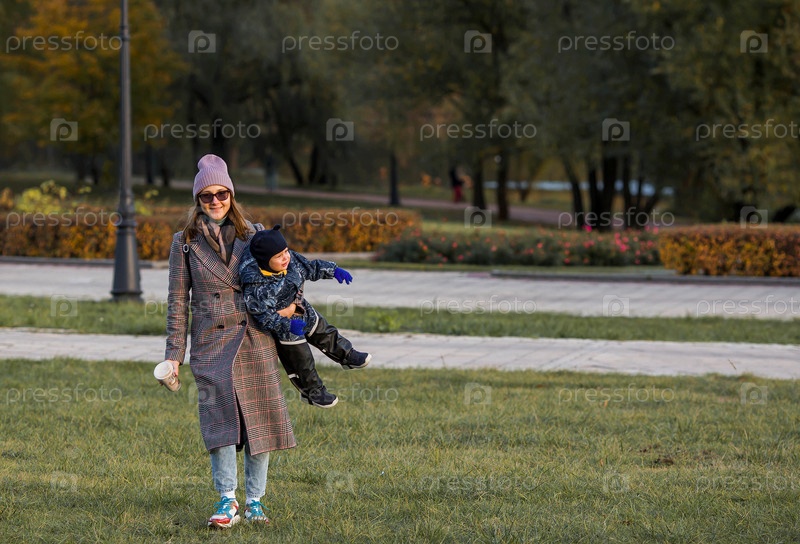 Красивый, веселый мальчик 2 лет гуляет в парке осенью. Мама играет с малышом на свежем воздухе. Понятие родительства, детства и семьи