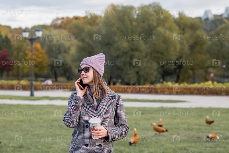 Теплым осенним днем женщина идет по парку. Девушка пьет кофе и разговаривает по телефону