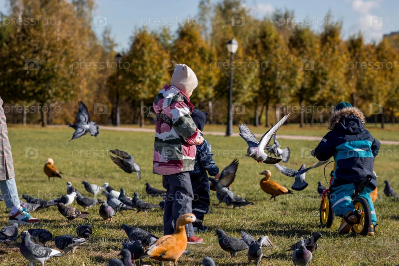 Семья с тремя детьми. Многодетная мать и дети в осеннем парке. Дети играют на улице и кормят голубей и уток. Многодетность и семейные ценности