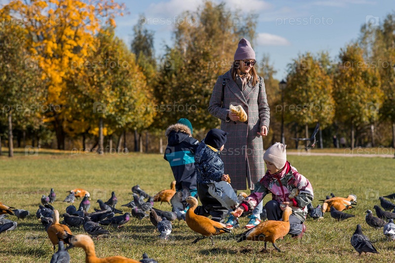 Семья с тремя детьми. Многодетная мать и дети в осеннем парке. Дети играют на улице и кормят голубей и уток. Многодетность и семейные ценности