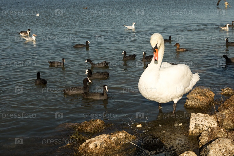 Белый лебедь на поверхности воды летним днем