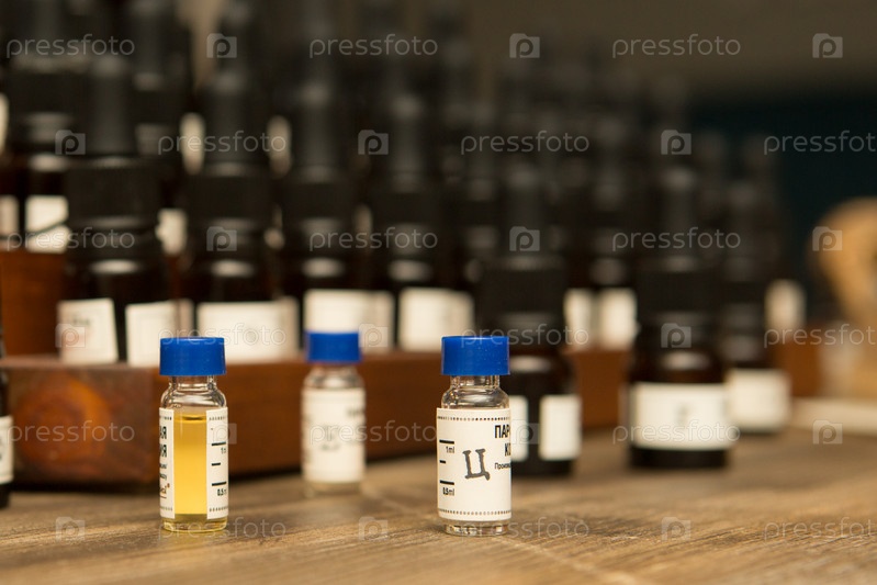 Небольшой стеклянный флакончик эфирного масла с бумажной этикеткой