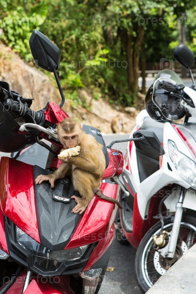 Маленькая милая обезьянка шалит на мотоцикле