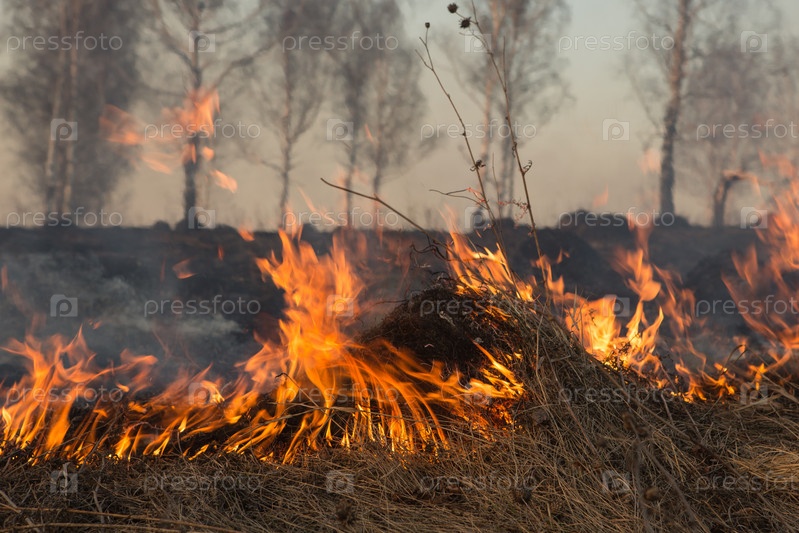 Лесной пожар горит, лесной пожар крупным планом в дневное время