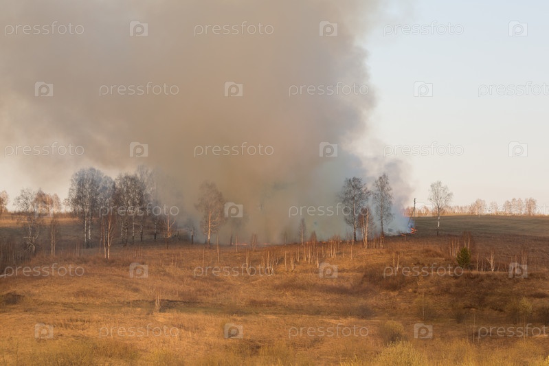 Лесной пожар горит, лесной пожар крупным планом в дневное время