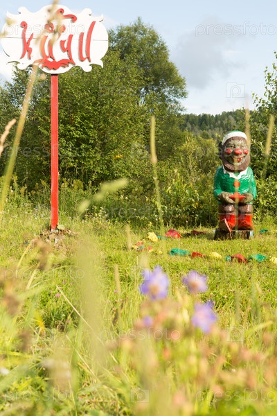 Старые деревянные скульптуры в лесу. Горная Шория, Россия