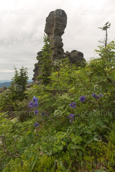 Большие камни курума лежат в лесу в горах, камни покрытые мхом, на фоне леса, горный пейзаж, высоко в горах