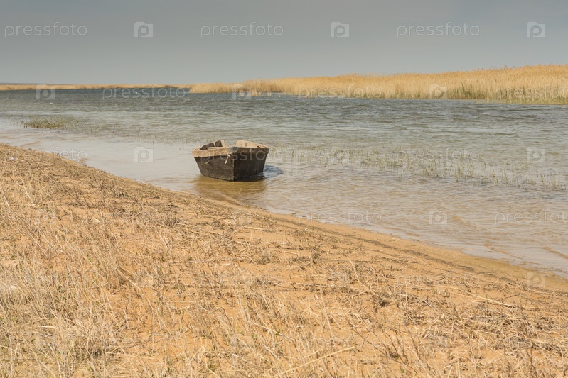 Лодка в воде. Гребные лодки в камышах. Деревянная лодка на озере в летний день. Аральское море, Казахстан