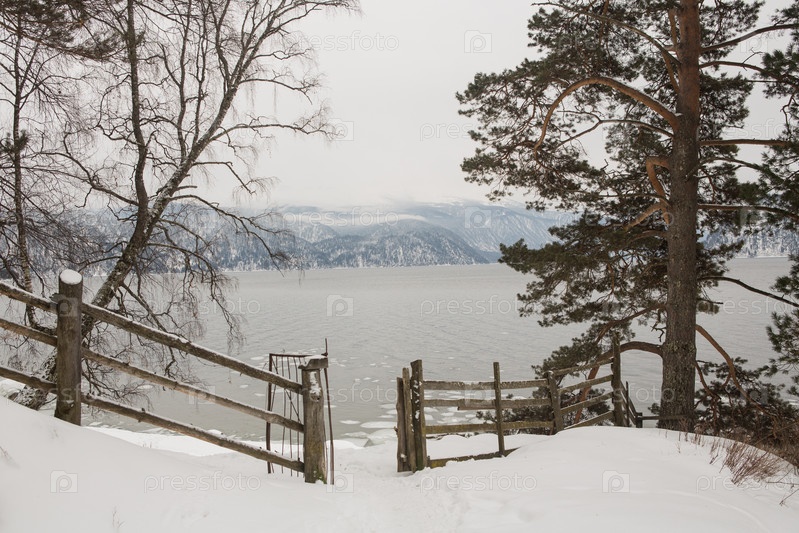 Незамерзающее Телецкое озеро зимой. Россия Алтайский край