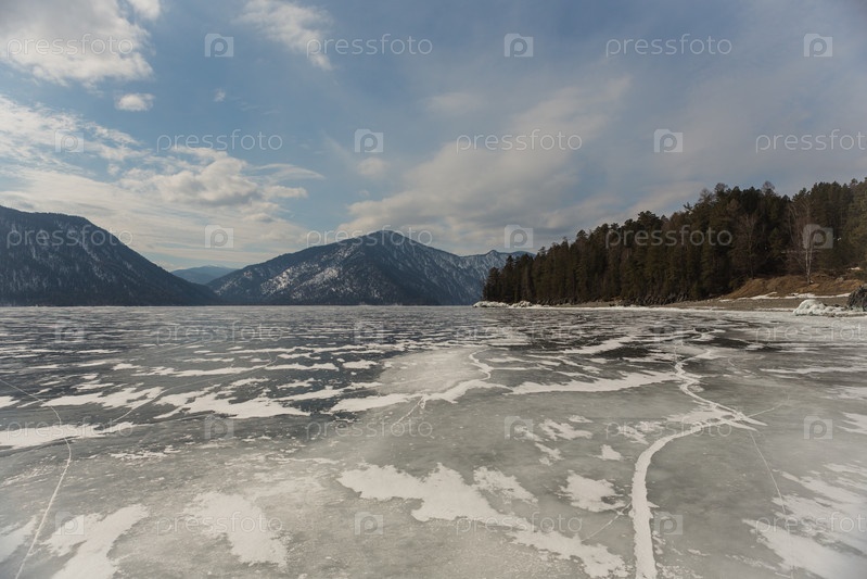 Вид на красивые рисунки на льду из трещин на поверхности Телецкого озера зимой, Россия