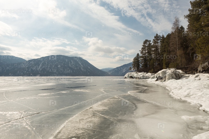 Вид на красивые рисунки на льду из трещин на поверхности Телецкого озера зимой, Россия