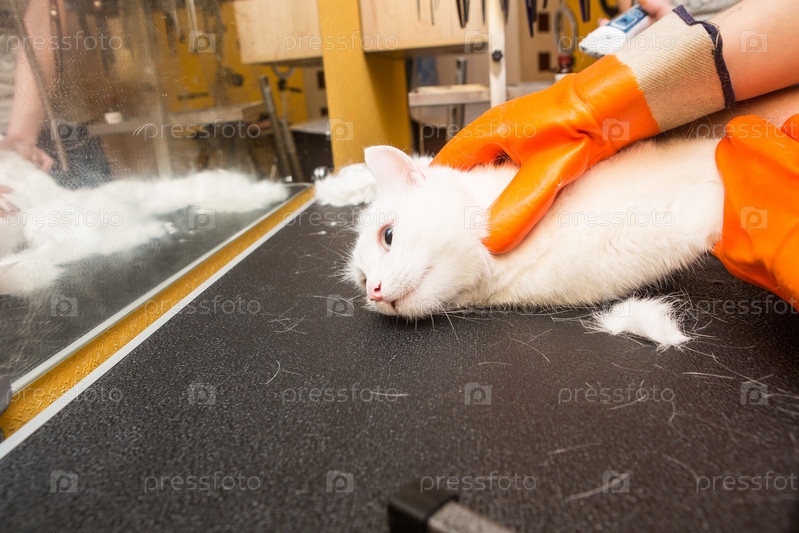 Красивая кошка в салоне красоты. Стрижка животных, мытье купающейся кошки, расчесывание шерсти, сушка феном. Мастер по грумингу, уход за кошкой