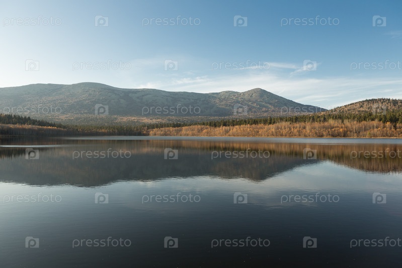 Осенний пейзаж в горах. Отражение гор и желтых, зеленых деревьев на поверхности озера. Россия. Сибирь