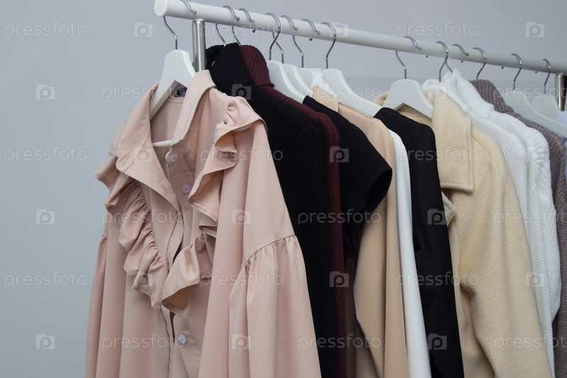 Выбор модной одежды разных цветов на вешалках