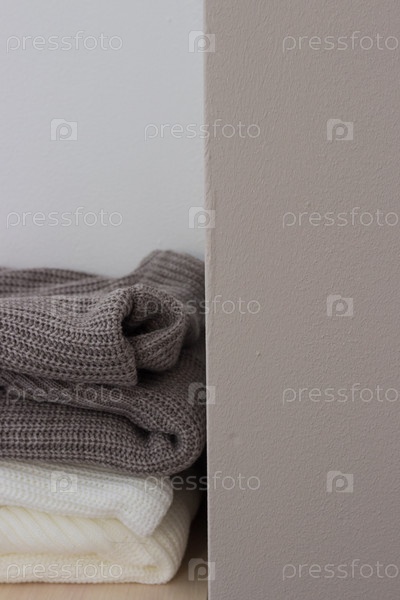 Стопка шерстяных свитеров на полке. Серо-белый свитер. Теплый и уютный. Вязаная одежда. зимняя одежда