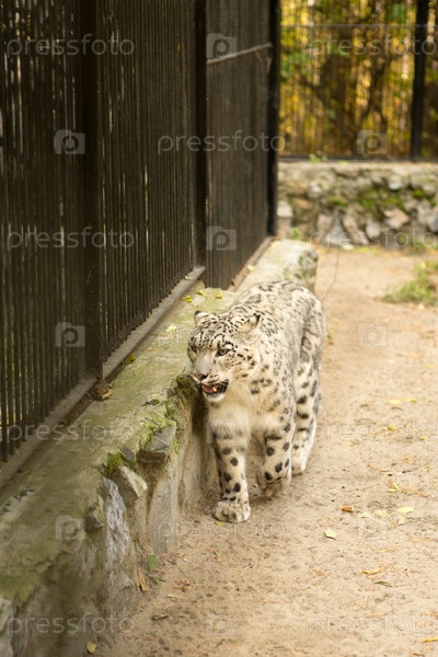 Снежный барс гуляет в клетке