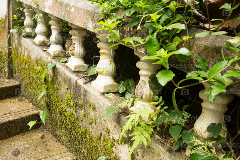 Природа против каменных джунглей. Старая поврежденная балюстрада в заброшенном доме. поврежденные балясины потемнели от времени и непогоды и покрылись трещинами. сквозь камень проросла трава