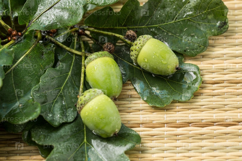Дубовый желудь с зелеными листьями