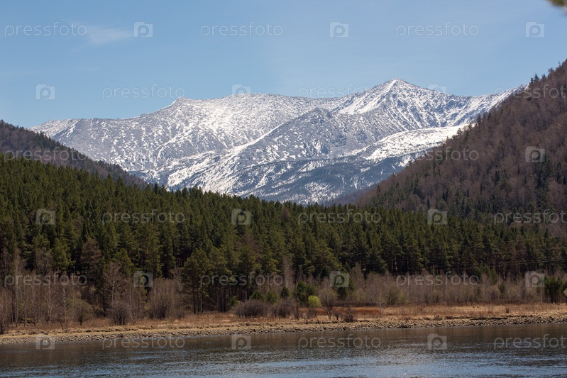 Красивый вид на реку Енисей, заснеженные горы и лес в ясный день