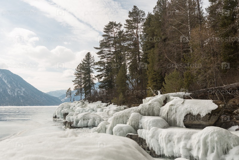 Вид на красивые рисунки на льду из трещин на поверхности Телецкого озера зимой, Россия