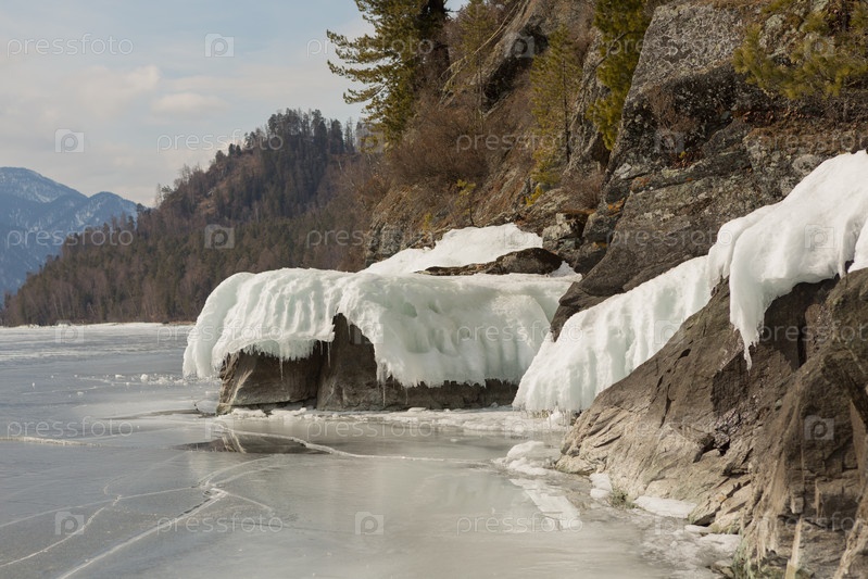 Вид на красивые рисунки на льду из трещин на поверхности Телецкого озера зимой, Россия