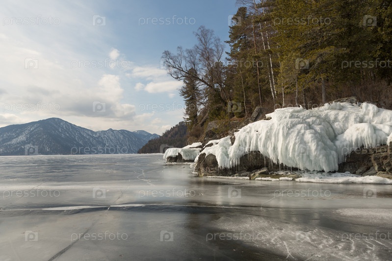 Вид на красивые рисунки на льду из трещин на поверхности Телецкого озера зимой, Россия