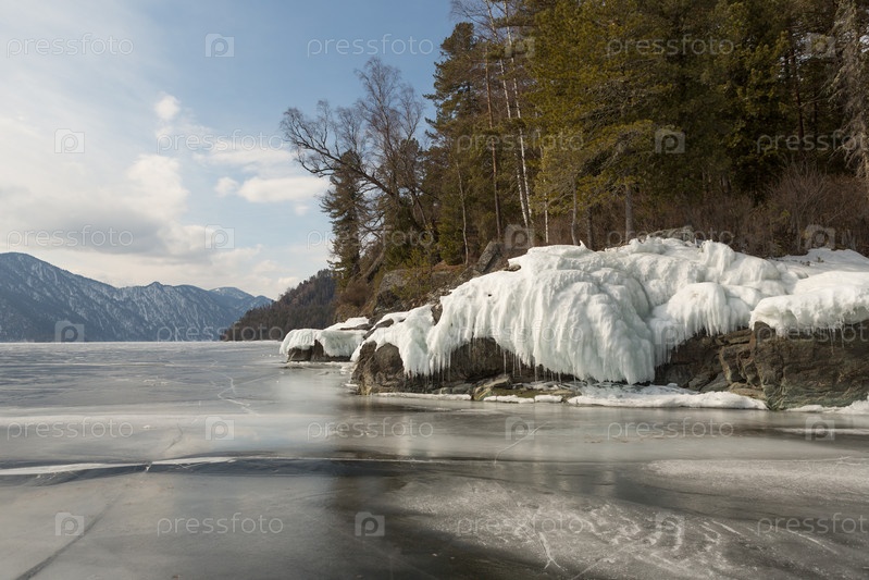 Вид на красивые рисунки на льду из трещин на поверхности Телецкого озера зимой, Россия