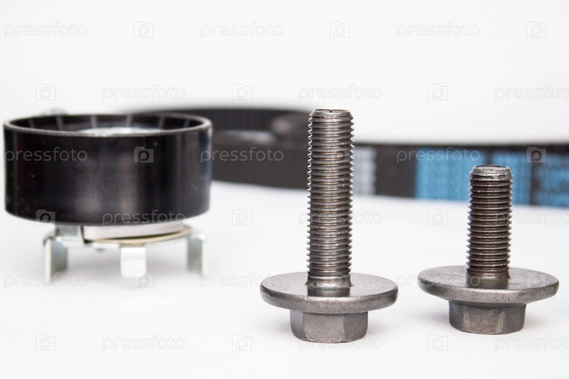 Ремонтный комплект: зубчатый ремень и болты, изолированные на белом фоне. Автомобильные запчасти