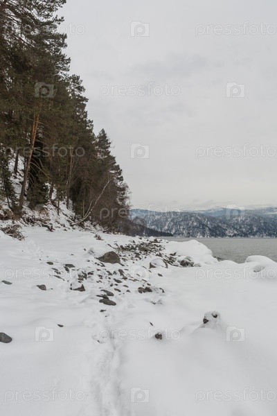 Незамерзающее Телецкое озеро зимой. Россия Алтайский край