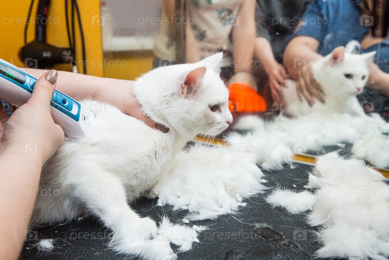 Стрижка кошек в салоне для животных. Женщина использует триммер для стрижки шерсти