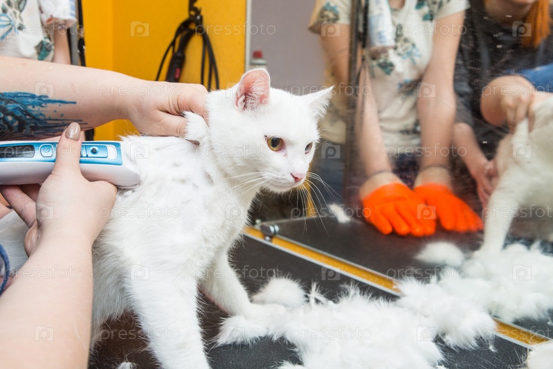 Стрижка кошек в салоне для животных. Женщина использует триммер для стрижки шерсти