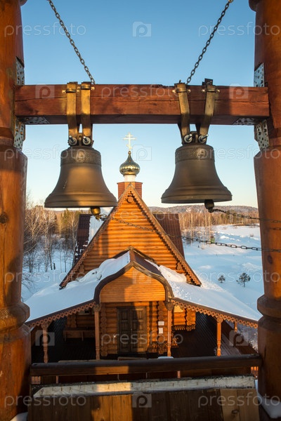 Вид на колокола и купол небольшой сельской церкви в селе Увал, Россия-Сибирь