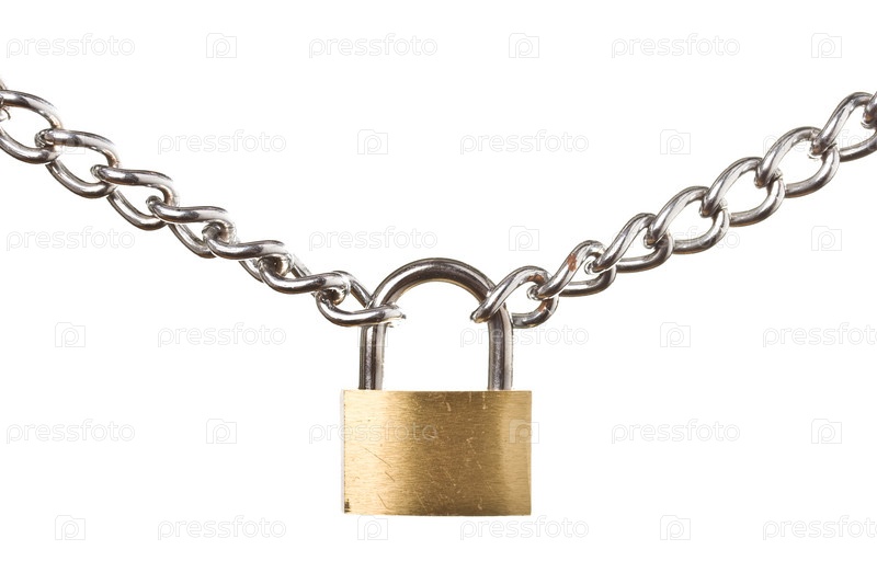 Концепция безопасности - замок на цепи, изолированный на белом фоне